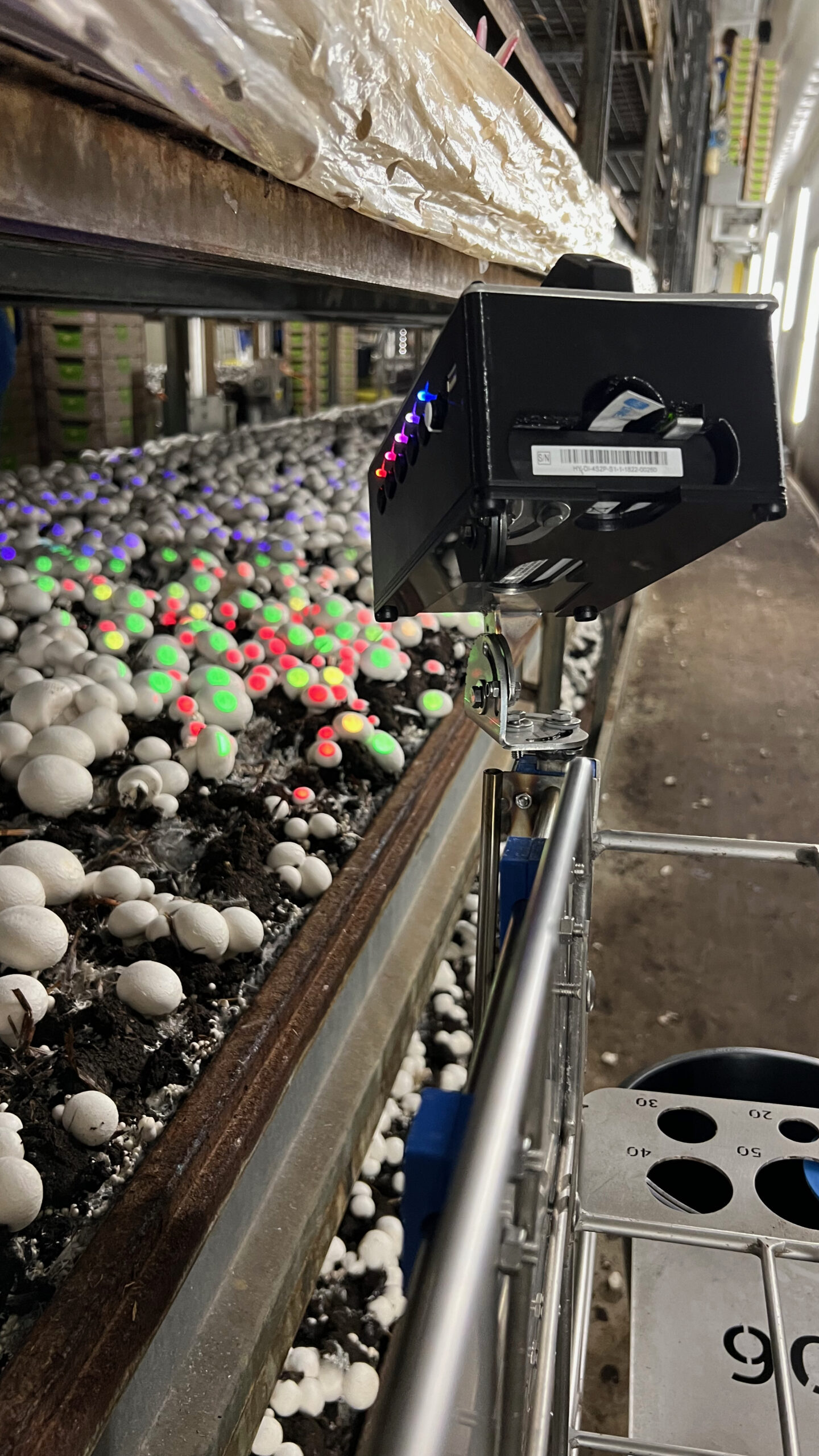 Het Spotlight Systeem fungeert als het brein van de oogstoperatie. Het scant de teeltstellingen in real time en projecteert via centrale software lichtpunten op de champignons die geoogst moeten worden.