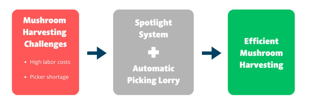 Wereldwijd krijgen champignontelers te maken met stijgende loonkosten en een tekort aan ervaren plukkers. GTL Europe biedt een hightech antwoord op deze industriële uitdagingen. Wij combineren de automatische pluklorrie met het Mycosense Spotlight Systeem. Deze integratie transformeert handmatig oogsten naar een professionele en datagedreven operatie.